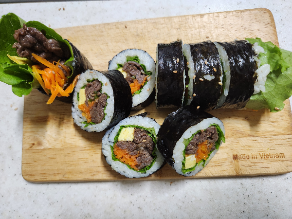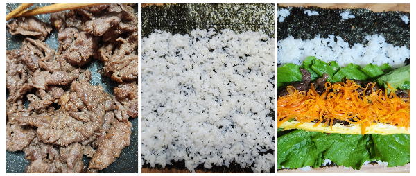 다른 건 다른 김밥과 다 동일 하지만 불고기 김밥 말 때는 상추나 깻잎을 넣는데 상추가 전체적으로 재료를 감싸고 있어야 잘랐을 때 보기가 좋다.