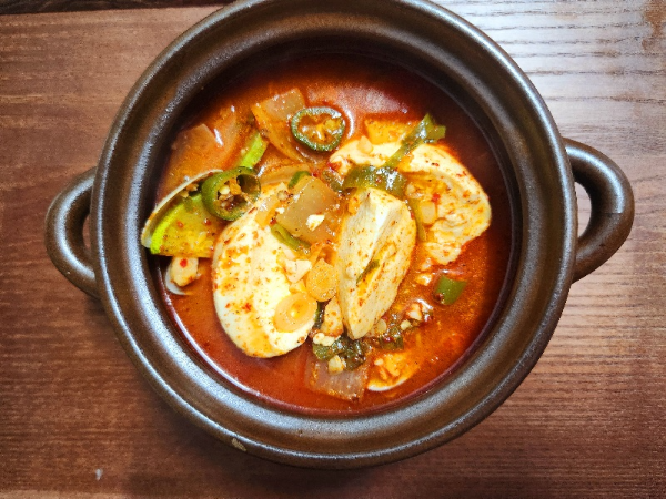 순두부찌개는 뚝배기에 담고 팔팔 끓이고 마지막에 계란 1개를 톡 까서 넣고 잠시 기다린 후 순두부 속의 계란이 반숙이 됐을 때 조심히 반숙을 들어 올려 쌀밥에 살포시 올려 통째로 반숙을 먹는 맛이란 크 먹어도 먹어도 질리지 않는 맛이다.